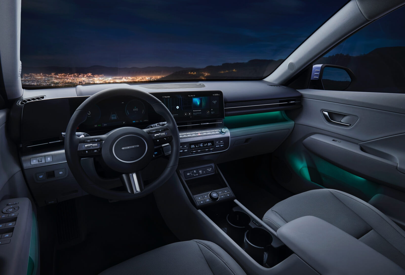 Selv Essentiel-versionen har højt udstyrsniveau med digital instrumentering, touchskærm, klimaanlæg, Bluelink, trådløs Apple CarPlay, bakkamera, parkeringssensorer, LED-forlygter, batterivarmer og omfattende sikkerhedssystemer som automatisk nødbremse, vognbaneassistent og skiltegenkendelse.